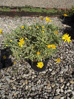 Cineraria 'Silver Star' is a winnner! I say it's like a mini version of 'Dusty Miller' with the bonus of yellow, daisy flowers. Just look how great it looks as an edging plant to unite the elements of our mixed garden. It makes the paws of fame look quite good too! 15cm pot plants